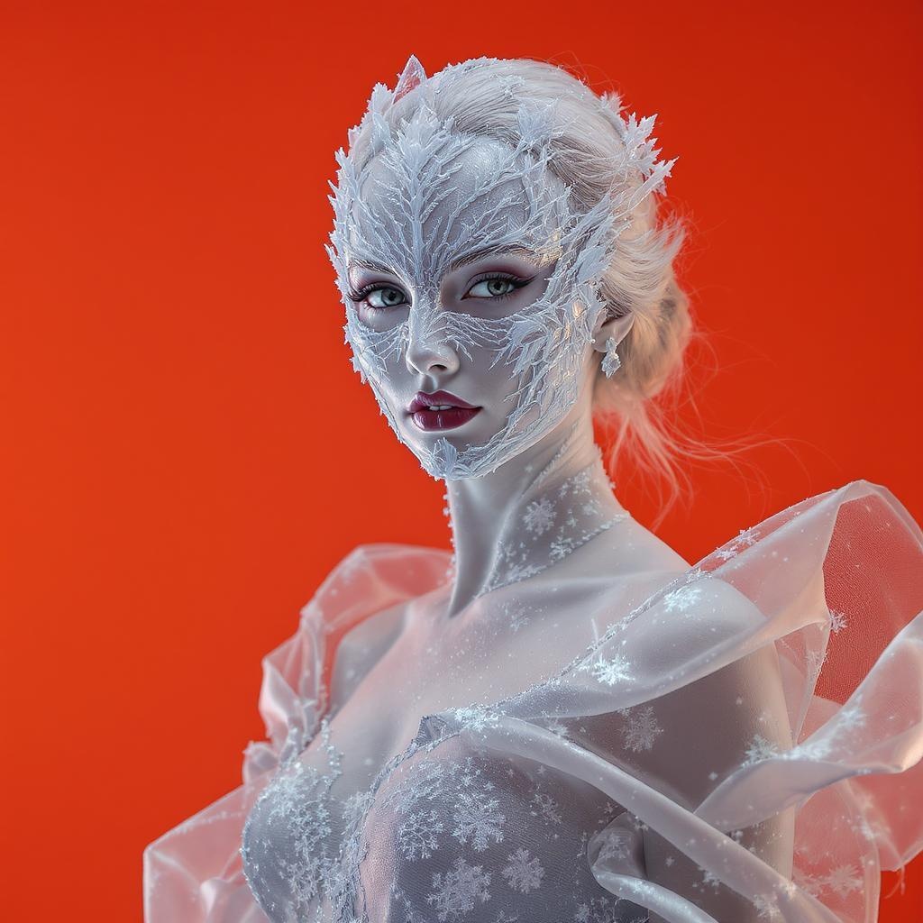 A hyper-realistic portrait, in HD, 8K, of a woman wearing a mask sculpted from shimmering ice and frost, its smooth translucent surface adorned with delicate crystal formations branching in asymmetric fractal patterns. She is draped in a flowing gown of luminous silver and white silk, intricately embroidered with snowflake motifs, the fabric glistening like it has been touched by frost. The gown moves as if suspended in a perpetual gentle winter breeze, creating an ethereal sense of motion. Her hair, a cascade of silken white waves, glows faintly, complementing her porcelain-like skin that emits a subtle, frost-kissed glow. The background is a vivid orange-red, contrasting with the icy elements of her attire, enhancing her frozen elegance. Cool, soft lighting highlights the translucent mask and the icy shimmer of her gown, enveloping her in an aura of otherworldly magic and pristine winter beauty.
