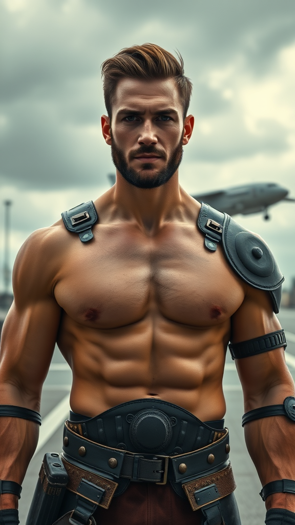 A hyper-realistic portrait of a 28-year-old Israeli Caucasian male, showcasing a full-body triangulation from head to toe. The wide field of view captures the full-length of a dominant, alpha figure with a muscular, perfectly proportioned physique and a hairy chest. His smaller head is adorned with shiny hair, set against the backdrop of a spaceport where a sci-fi ship is taking off. The overcast sky casts a cinematic, moody light, enhancing the dramatic effect. He's clad in plate leather armor, rich in fine detail, emphasizing natural textures. The scene is filled with a light atmosphere and volumetric lighting, featuring an action pose in an epic, movie-style moment. The photorealistic rendering with natural blur and high detail creates an ultra-HD, vibrant portrait with cinematic qualities and ray tracing. The composition is free of common photography errors, capturing the essence of a sci-fi adventure with innovation and finesse.