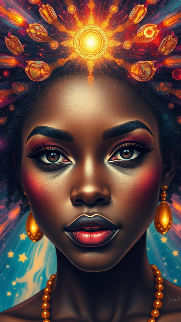 A hyper-realistic portrait of a black woman radiating cosmic energy, with a vibrant explosion of colors surrounding her. Her face is beautifully symmetrical, exuding a nonchalant kindness, with realistic, expressive round eyes. The artwork is tone mapped, intricately detailed, and exudes elegance. This digital painting draws inspiration from art styles of Artgerm, Greg Rutkowski, and Alphonse Mucha, creating a dreamy, magical atmosphere. The image is in sharp focus, capturing every nuance in 4k and 8k resolution, crafted as a smooth illustration fit for concept art. Her presence is enchanting, mesmerizing viewers with an aura of cosmic mystery.