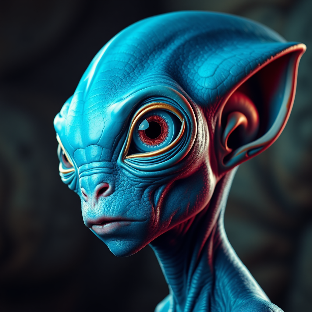 A hyper-realistic portrait of a blue alien with one large eye and prominent ears, featuring a stunning array of vibrant colors. The character is centered, with a symmetrical and intricately detailed face, showcasing detailed skin textures. The lighting is cinematic and dramatic, enhancing the epic sci-fi and fantasy atmosphere. This digital painting is a masterpiece of digital art, in sharp focus and rendered in 8k resolution, capturing every nuance of the alien’s unique features. The setting and design elements are ultrarealistic with an HDR effect, presenting a refined and polished visual style that is imaginative and striking. The side view composition highlights the alien’s distinctive profile.