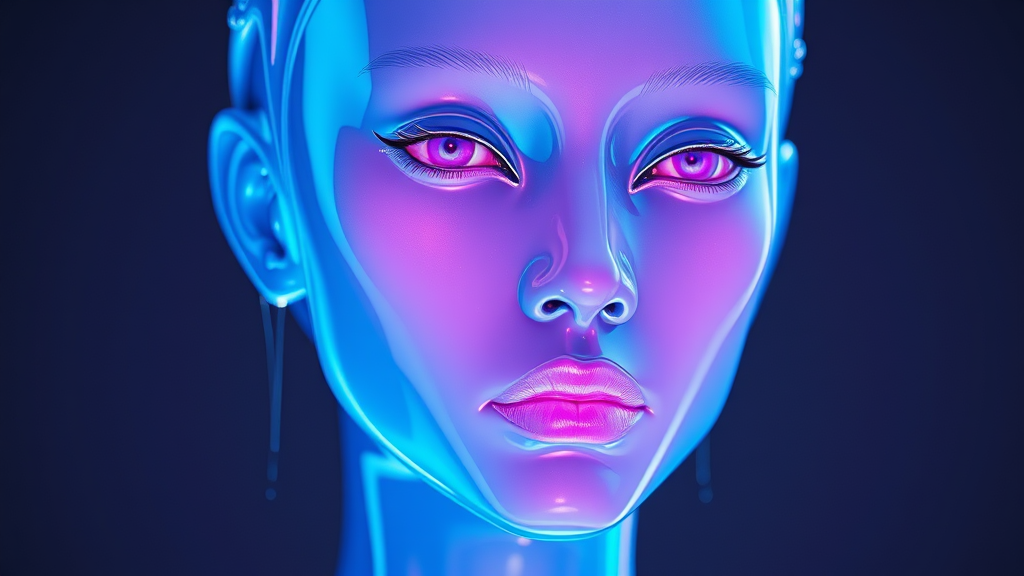 A hyper-realistic portrait of a blue figure with a luminous pink face, its features covered in iridescent fluids, embodying a futuristic sci-fi aesthetic. The design is infused with Asian-inspired elements, with an ethereal blend of light white and pink hues, showcasing a glossy, shiny surface. The image captures photorealistic accuracy with an aurorapunk vibe, maintaining the essence of a three-quarter pose. The ambiance feels otherworldly, with subtle reflections and a sleek, raw style, hinting at advanced technological themes.