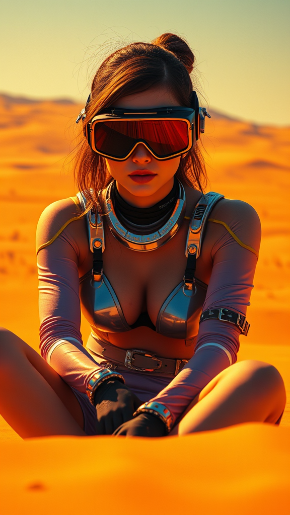 A hyper-realistic portrait of a female character sitting in a vast desert landscape, her eyes hidden behind sleek, futuristic goggles. Her attire reflects a cyberpunk aesthetic with metallic accents gleaming in the harsh sunlight. She embodies the essence of womancore, her presence both powerful and enigmatic. The scene is infused with a vibrant outrun color palette, neon hues contrasting with the earthy desert tones. Her outfit features angelcore-inspired elements, creating a celestial juxtaposition amidst the barren surroundings. The hyper-detailed imagery captures every texture and shadow, blending realistic features with a pop art influence, imbuing the scene with a surreal, dreamlike quality.