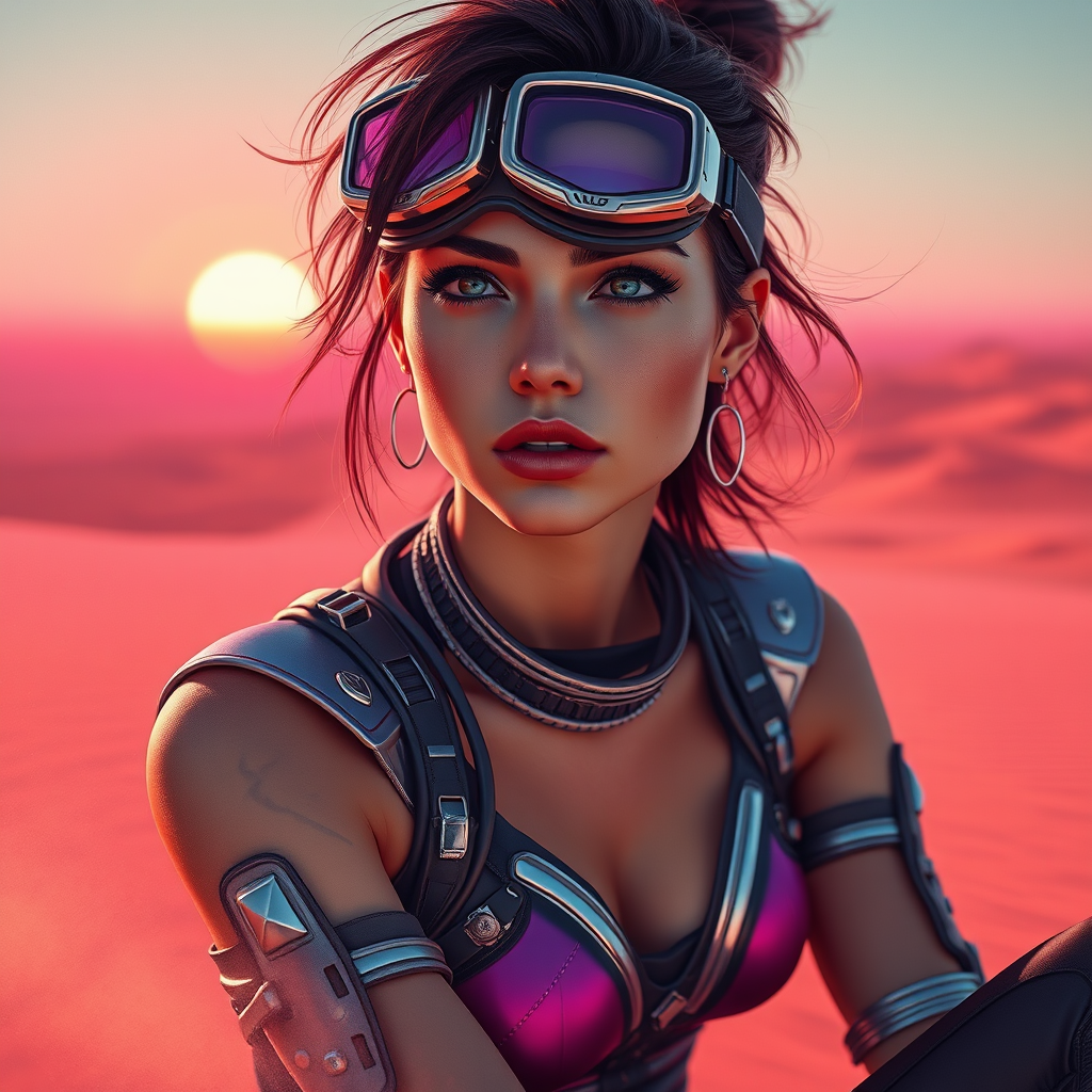 A hyper-realistic portrait of a female character with striking features, wearing futuristic goggles, sitting serenely in the vast desert. Her attire combines cyberpunk elements with intricate metallic accents, showcasing a blend of womancore and angelcore aesthetics. The landscape around her reflects an outrun vibe, with vibrant neon hues contrasting against the sandy backdrop. Her outfit mingles high-tech materials with ethereal touches, embodying a fusion of strength and otherworldly grace. Her expression is contemplative, gazing toward a distant horizon, with the sun casting dramatic shadows across her face. Dust swirls gently around her, adding a sense of motion and mystique to the scene.