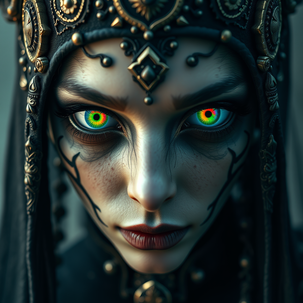A hyper-realistic portrait of a figure from the dark kingdom, featuring mesmerizing, hyper-detailed rainbow eyes that convey a haunting sense of horror. Her attire is steeped in intricate symbolism, crafted with extraordinary detail. The image is captured using the Hasselblad H4D 200MS Digital Camera with a Mitakon Speedmaster 65mm f/1.4 XCD lens, emphasizing the intense depth and richness of the scene. The composition possesses an ethereal, otherworldly aura, as the eyes serve as windows to a mysterious and unsettling world.