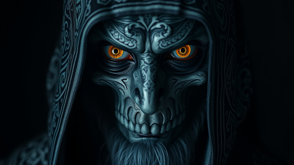 A hyper-realistic portrait of a figure from the shadowed realm, featuring mesmerizingly detailed eyes that exude pure horror. The attire is adorned with complex and symbolic orthodox designs, capturing a timeless essence. The shot is taken using a Hasselblad H4D 200MS Digital Camera paired with a Mitakon Speedmaster 65mm f/1.4 XCD lens, illuminated dramatically with Fresnel lighting, capturing every intricate detail in stark relief.