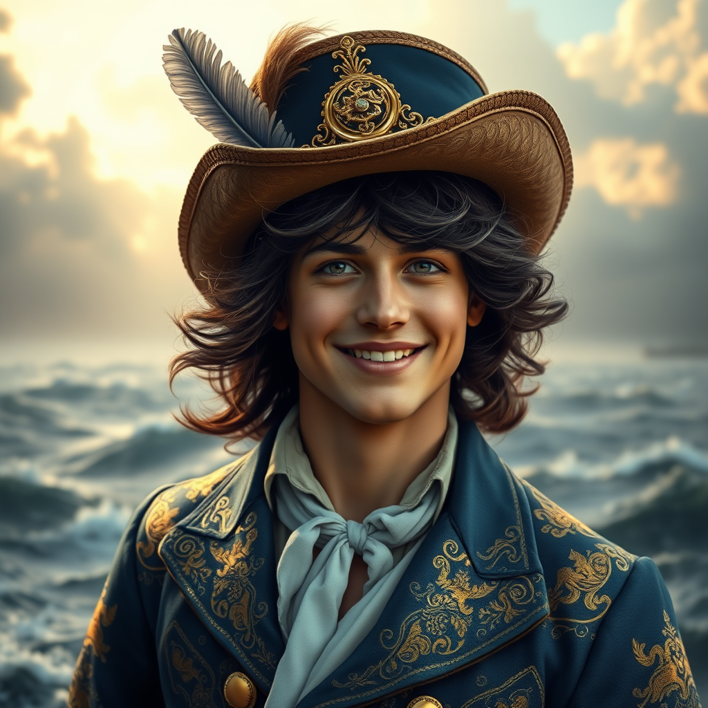 A hyper-realistic portrait of a flamboyant, adventurous sailor with a wide-brimmed hat adorned with an elegant feather, his youthful, sun-kissed face framed by wavy, tousled dark hair; his confident smile reveals boundless determination. The intricate patterns of his ornate baroque-style coat shimmer with golden hues in the soft light, reflecting his vibrant spirit. He stands against a backdrop of turbulent seas beneath a moody, dramatic sky, capturing the essence of an intrepid explorer.