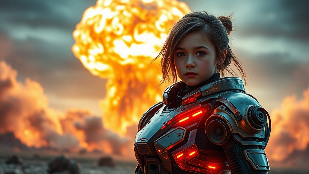 A hyper-realistic portrait of a girl in an intricately designed exo suit, her sci-fi armor gleaming under the intense light of a nuclear explosion. The background captures the dramatic blast wave spreading outwards, interspersed with swirling nuclear ash. The scene showcases the atomic fission aftermath, with an emphasis on max detail and cinematic style. Photographed in 8K UHD, the image captures a full-body view, resembling a still from a futuristic movie with complex lighting and dynamic composition. The setting evokes a science fiction world, with the flash of nuclear light and a sense of velocity and acceleration. The perspective is third-person, as if captured with a long exposure, highlighting the interplay of futuristic elements and artistic flair in a largely photorealistic style.