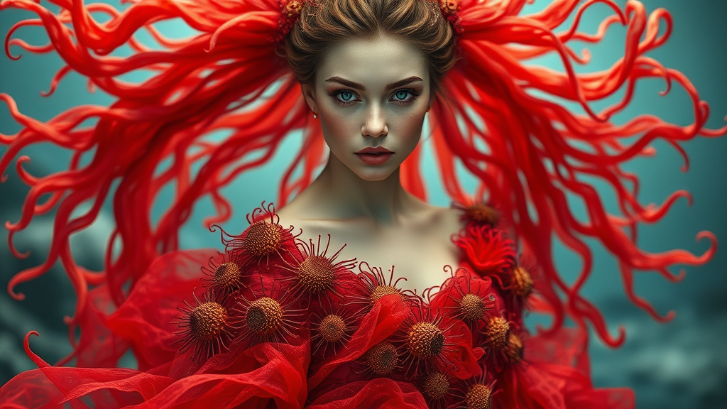 A hyper-realistic portrait of a goddess with an ethereal aura, her striking features meticulously detailed to capture every nuance of her divine visage. She is adorned in a resplendent vivid red gown that cascades brilliantly, crafted entirely from intricate sea urchins and the delicate, undulating tentacles of anemones. The ensemble creates a mesmerizing contrast with her serene and powerful expression. The composition embraces a full-body view, expertly utilizing depth of field to accentuate the goddess’s presence against a blurred, mystical oceanic background. Her long flowing hair, blending with hints of coral and seaweed, dances around her in harmony with her dress. This image embodies elegance and mystique, merging land and sea in perfect artistry.