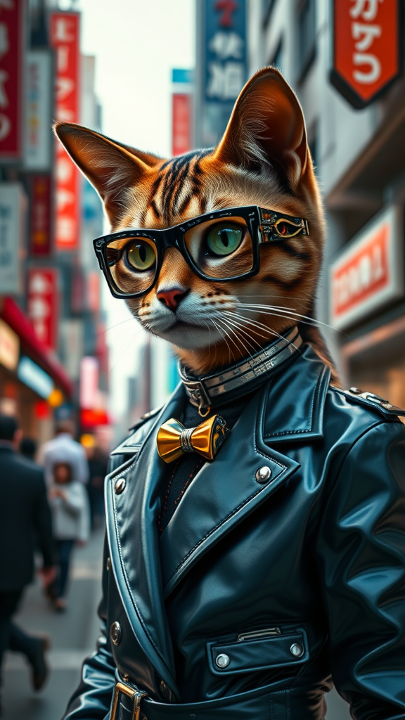 A hyper-realistic portrait of a humanoid cat dressed in avant-garde Mugler fashion amidst the vibrant streets of Tokyo, captured in surrealist pop style. The feline figure exudes elegance with intricately detailed fur, donning an outfit that harmonizes futuristic design elements and bold colors, reflective of Tokyo's eclectic fashion scene. The scene, rendered in octane, showcases the lifelike textures and vivid contrasts, enhanced by natural lighting that highlights the glossy fabrics and metallic accessories, set against the bustling urban backdrop in stunning 8k resolution.