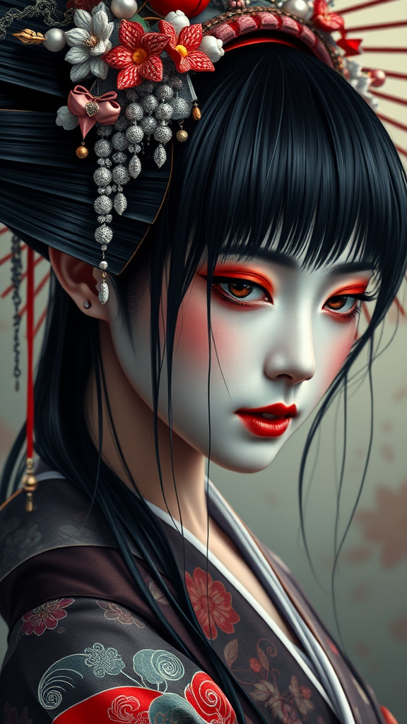 A hyper-realistic portrait of a Japanese black-haired geisha with a melancholic expression, featuring an intricate dripping art style, vibrant and super detailed, exuding elegance and hypermaximalism. The image is captured in Super-Resolution, showcasing epic megapixel clarity with a focus on the insanely detailed and refined elements of her traditional attire and delicate features, blending a somber mood with striking colors.