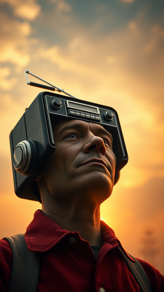 A hyper-realistic portrait of a man with a vintage radio for a head, set against a backdrop of a pale sunrise with dramatic, cinematic lighting. Captured from a low angle, the scene is infused with intricate details that evoke a sense of awe, rendered in stunning 4k resolution. Inspired by the imaginative worlds of Studio Ghibli and the exquisite skies of John Constable, this masterpiece reveals an ethereal atmosphere, crafted using the cutting-edge capabilities of Unreal Engine 5.