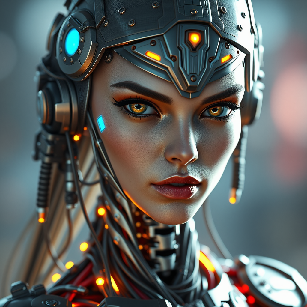 A hyper-realistic portrait of a mechanical Supergirl with detailed facial features, rendered in 8k with global illumination and dynamic shadows. Her design incorporates intricate metal ornaments and cold-colored Egyptian details, accented by glowing neon elements. The lifelike depiction includes cybernetic limbs with visible blood vessels and tubes, a mechanical cervical connection at the neck, and an array of wires and cables interfacing with her head. Her intense gaze is fixed at the camera, highlighted by radiant eyes. This imagery is trending on CGSociety, emblematic of a fusion between mechanistic aesthetics and human elements, underpinned by a realistic lighting setup.