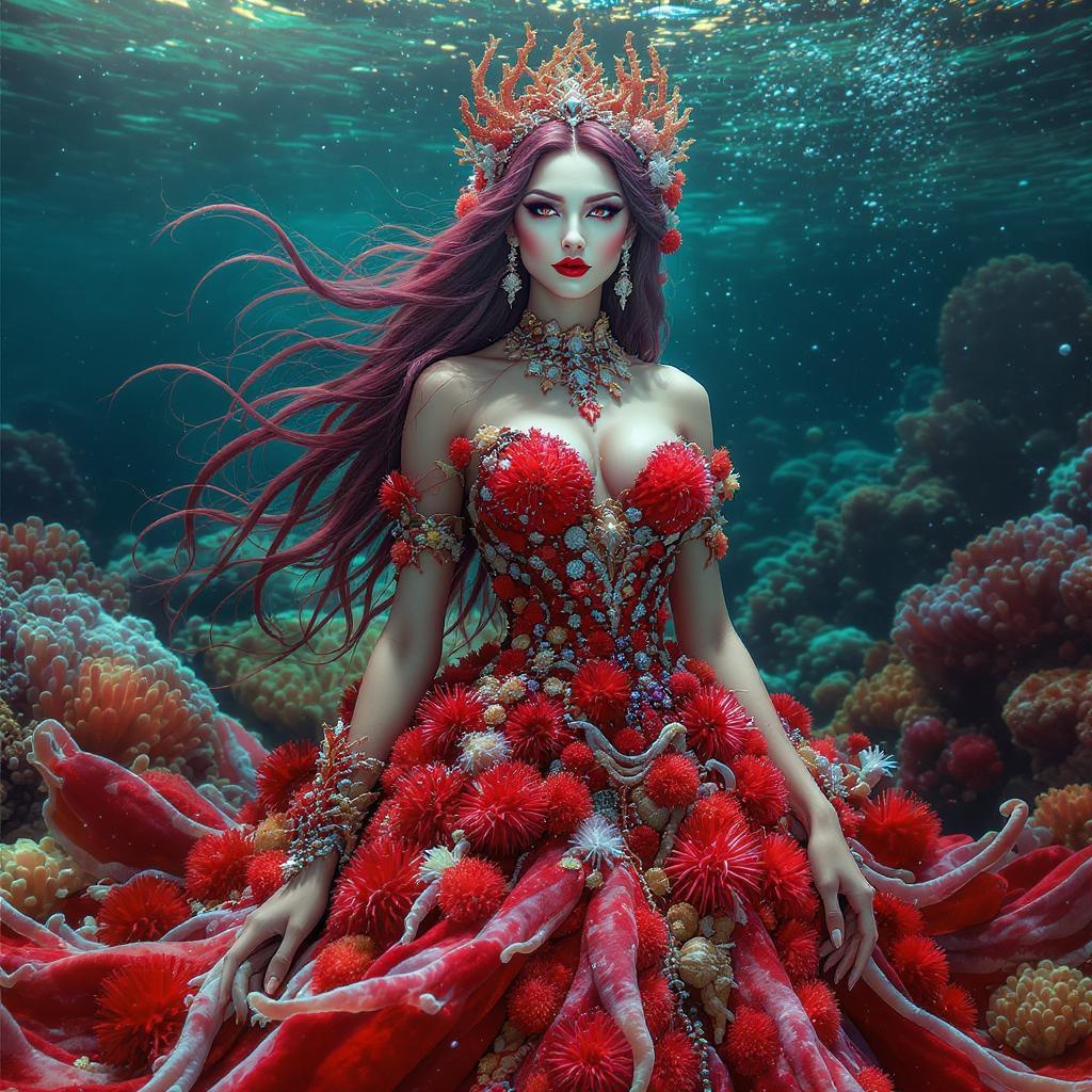 A hyper-realistic portrait of a mythical goddess, her face exuding ethereal beauty and wisdom. She is adorned in an exquisite, flowing gown crafted from vibrant red sea urchins and intricate anemone tentacles, each detail meticulously captured. The dress shimmers like the ocean's surface at sunset, the textures and colors creating a mesmerizing effect. Her hair cascades in waves, adorned with delicate coral pieces. The portrait photography showcases her full figure with exceptional depth of field, highlighting the vivid contrasts and ethereal nature of her attire, set against a serene marine backdrop, evoking an aura of divine elegance.