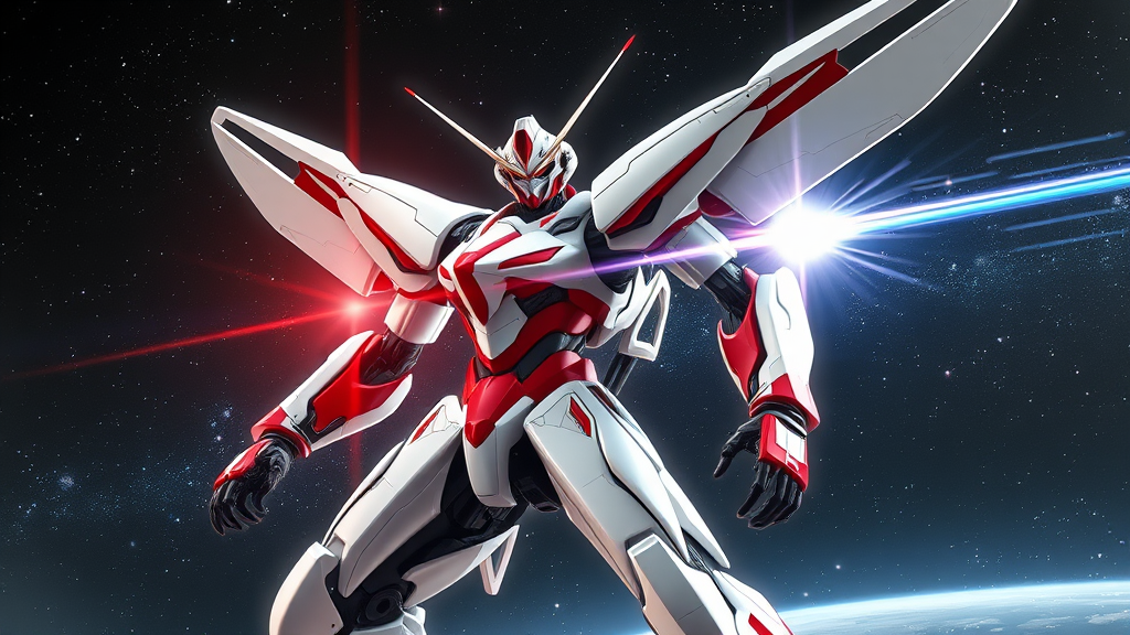 A hyper-realistic portrait of a sleek, futuristic mech with insectoid features, poised in a dynamic fighting stance. The glossy white and red armor reflects intricate details reminiscent of Tsutomu Nihei and Akira's art styles. The mech's slender form is accentuated by Sci-fi wings and stands ready amidst a dramatic outer space setting, illuminated by the radiant light of a quasar. The background teems with the cosmos—stars and quasars creating a captivating vista. Powerful plasma beams and a blast wave add intensity, highlighted by complex lighting effects. This 8k ultra-high-definition anime and manga-inspired scene captures both the elegance and might of the streamlined sci-fi mech.