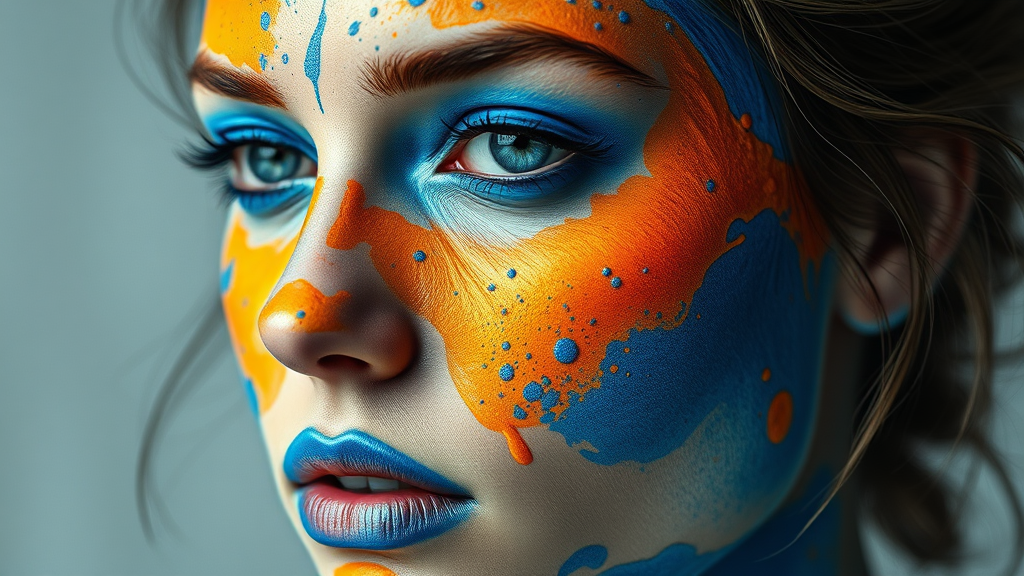 A hyper-realistic portrait of a woman adorned with blue and orange paint on her face, exhibiting fluid and polished metamorphic forms. The style is inspired by V-ray tracing techniques, with color splashes of dark cyan and vibrant yellow, achieving a seamless blend of photorealism. The composition captures intricate, lifelike details, enhanced by a stylized artistic touch, presenting an evocative blend of creativity and realism.
