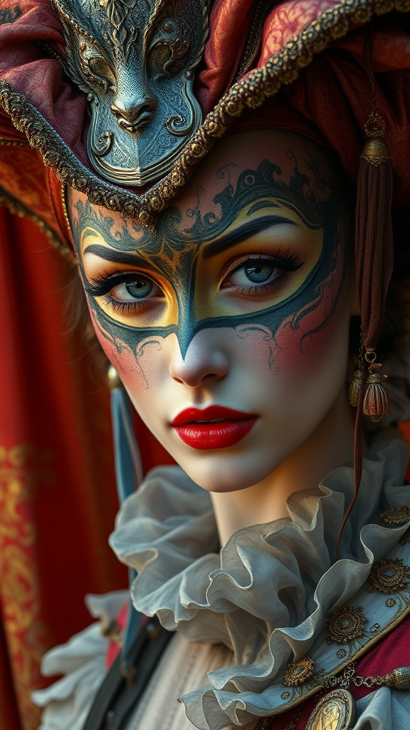A hyper-realistic portrait of a woman at the Venetian carnival, painted in ultra-detail, capturing the essence of Gerald Brom's style. Her expressive eyes and bold features are accentuated against the richly textured background of opulent fabrics and vibrant colors, typical of carnival attire, yet she wears no mask, revealing her enigmatic persona. The scene is rendered with oil painting techniques reminiscent of an Unreal Engine creation, blending meticulous details with an ethereal, almost otherworldly atmosphere, where every brushstroke highlights the subtle interplay of shadow and light on her face.