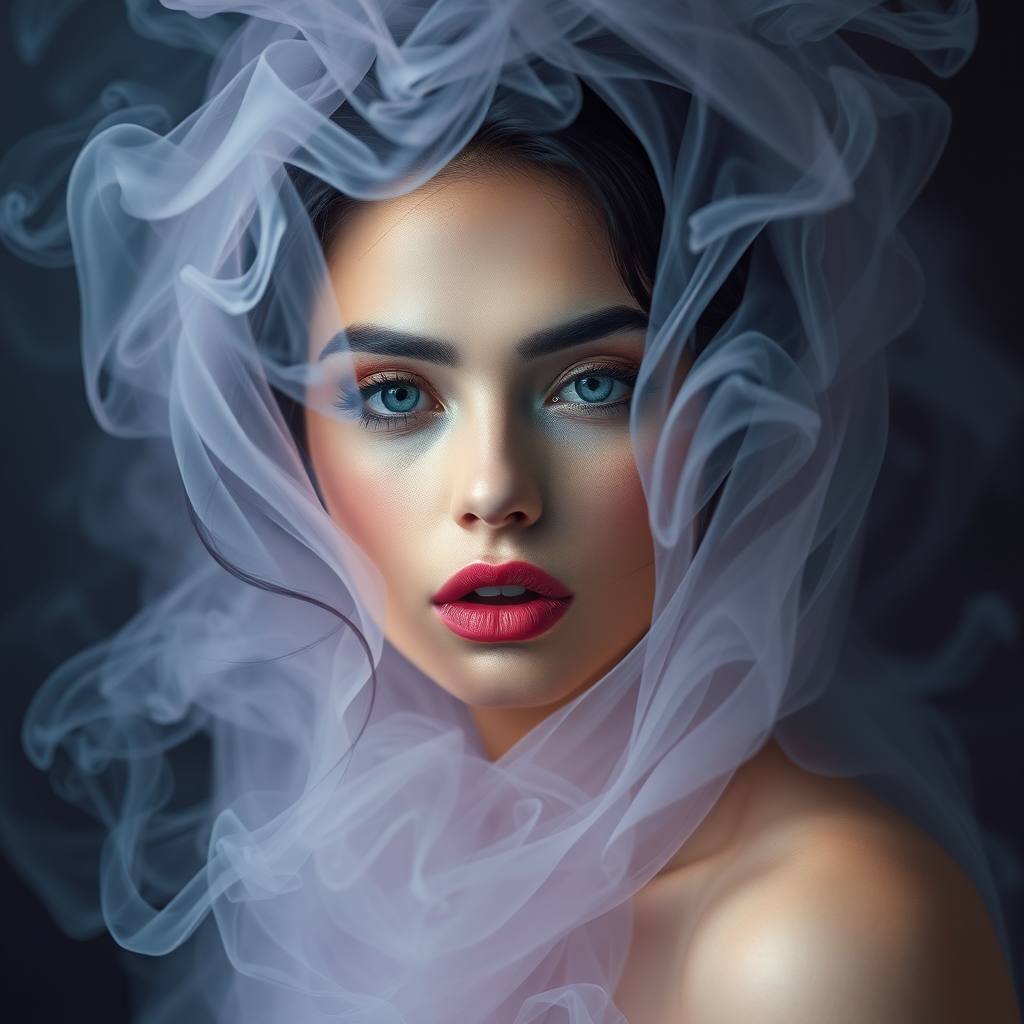 A hyper-realistic portrait of a woman enveloped in a swirling mist, her visage framed by ethereal tendrils of smoke. Subtle pink hues illuminate her features, enhanced by delicate pastel tones that highlight her elegant makeup. The scene exudes an air of mystery and allure, capturing a seductive, sultry essence in an oil painting style. The aesthetic intertwines modern artistic elements with breathtaking depth and vivid detail, creating a striking vision that tantalizes the senses.