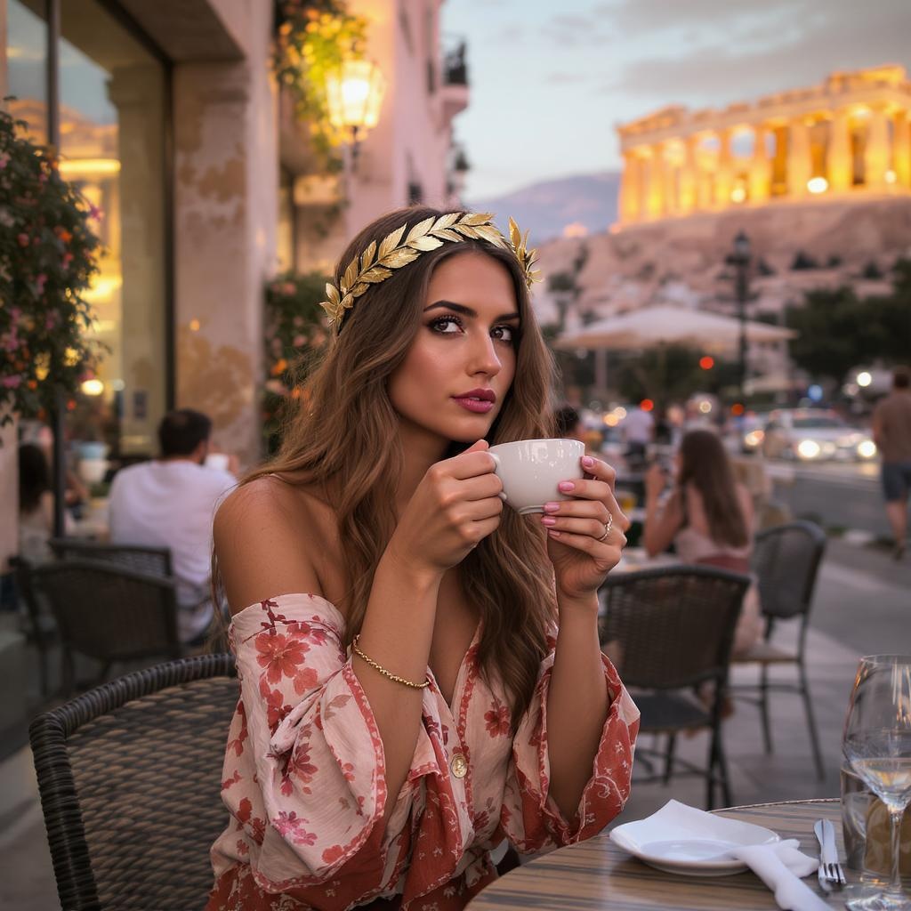 A hyper-realistic portrait of a woman in a boho-chic ensemble, seated at an outdoor café in contemporary Athens, sipping espresso while wearing a delicate golden laurel leaf crown. The scene captures the warm glow of dusk, with the Parthenon's silhouette softly blurred in the distance, adding a touch of timeless elegance to the modern city's atmosphere. Her expression is serene and thoughtful, as bustling life continues around her, reflecting the harmonious blend of ancient and new.