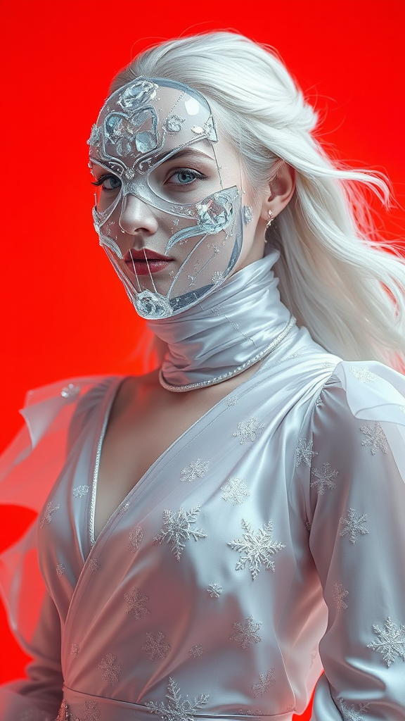 A hyper-realistic portrait of a woman with a mask sculpted from shimmering ice and frost, captured in stunning detail. The mask is smooth and translucent, adorned with delicate, asymmetrical crystal formations that mirror the fractal beauty of frozen water. She is dressed in a flowing gown of luminous silver and white silk, intricately embroidered with subtle snowflake patterns. The fabric sparkles as if kissed by frost, moving gently as if caught in a perpetual winter breeze, adding an ethereal sense of motion. Her hair cascades in silken white waves, shimmering softly to complement her pale, porcelain skin, which radiates a subtle, frost-touched glow. The backdrop is a vivid orange-red, providing a surreal contrast to her icy ensemble, enhancing her frozen elegance. Soft, cool lighting highlights the translucent details of her mask and the icy shimmer of her gown, enveloping her in an aura of enchanting winter magic and pristine beauty.