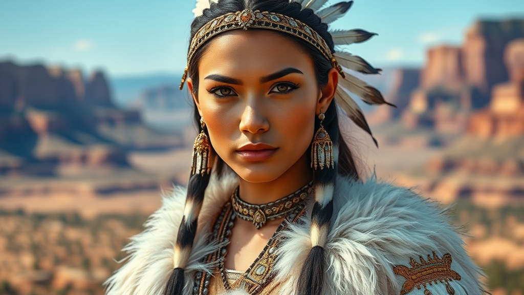 A hyper-realistic portrait of a young, beautiful Native American woman inspired by Madison Beer as Pocahontas, featuring perfect symmetrical facial features. She wears intricate feather jewelry and a traditional, handmade dress adorned with white fur and gold fabric, exuding the elegance of a skilled hunter and warrior. The setting is a breathtaking Utah landscape that complements her strong yet graceful presence. The image showcases the artistic styles of Artgerm, Greg Rutkowski, and Alphonse Mucha, capturing the depth and richness of the scene in 8k resolution. Her expression is both fierce and poised, with a depth of field that highlights her as the central focus, emphasizing her cultural heritage and strength.