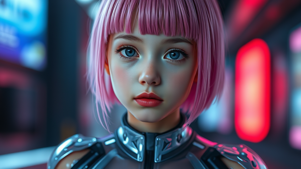 A hyper-realistic portrait of a young girl wearing a sleek, transparent futuristic outfit with cyberpunk and Evangelion-inspired design. She has a youthful, captivating face, framed by short, pink hair with blunt bangs. Her figure is slender with a narrow waist and thin thighs. The image captures extreme detail and intricate features, including textured skin and remarkably detailed pupils. The scene is lit cinematically, with a sharp focus reminiscent of DSLR photography, featuring depth of field and bokeh effects for a dramatic flair. The setting suggests a studio environment using a cinematic camera setup, capturing her essence in UHD, 16k resolution. The overall aesthetic is polished and dynamic, with a strong visual impact.