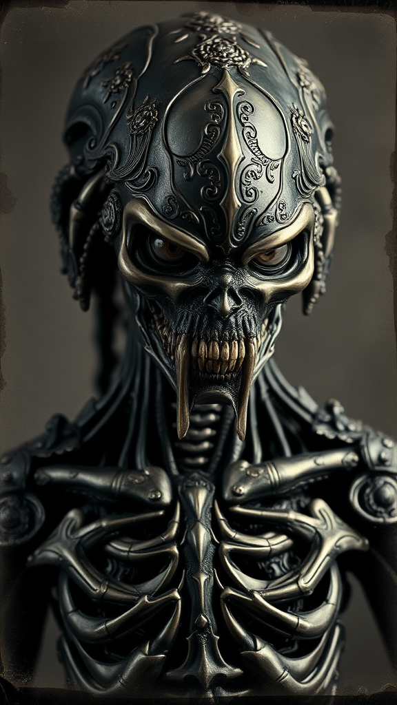 A hyper-realistic portrait of a zombie xenomorph warrior, captured with the wet plate collodion technique, showcasing sharp and high detail reminiscent of Mathew Brady's style. This character exudes a haunting beauty, with textures inspired by the intricate and otherworldly designs of Stefan Gesell and H.R. Giger, featuring the eerie elegance of Emil Melmoth's work. The warrior's form is adorned with ornate elements akin to Klimt's opulent patterns, merging organic and metallic surfaces in a mesmerizing interplay. Dark, smoky shadows cast across the figure, highlighting every sinew and alien feature with dramatic contrast, as its lifeless eyes seem to hold centuries of forgotten tales.