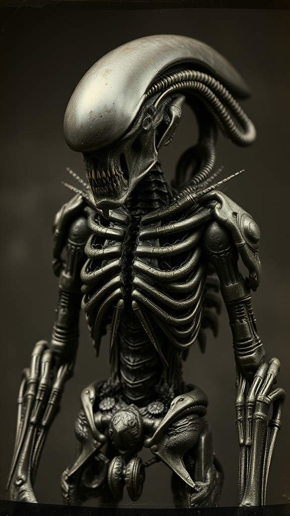 A hyper-realistic portrait of a zombie xenomorph warrior, captured in the wet plate collodion style, exhibiting sharp and high-detail features reminiscent of Mathew Brady's work. The creature stands as a formidable character, its alien exoskeleton intricately detailed, showing decay and eerily organic textures. Its form combines the dark, biomechanical aesthetics of HR Giger, with surreal, otherworldly elements inspired by Stefan Gesell and Emil Melmoth. Subtle metallic hues and patterns reminiscent of Klimt's mastery weave into the warrior's organic armor, adding an unexpected touch of elegance to its fearsome visage. Leaves a lasting impression with its hauntingly lifelike presence and artistic complexity.