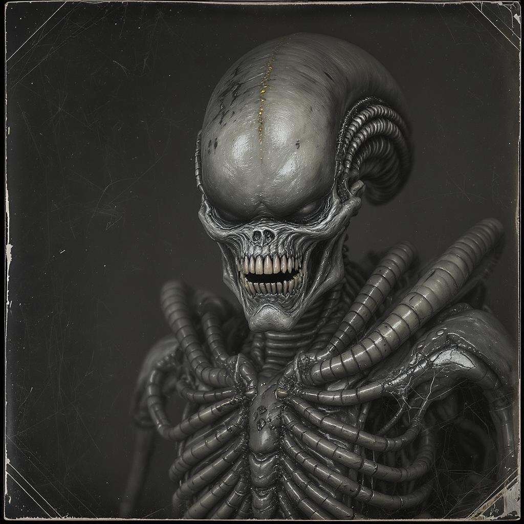 A hyper-realistic portrait of a zombie xenomorph warrior, captured in the wet plate collodion process with razor-sharp, high detail reminiscent of Mathew Brady's iconic photography style. The character blends the eerie, biomechanical elements of HR Giger with Stefan Gesell's dramatic lighting and unsettling atmosphere, while incorporating Emil Melmoth's dark, surreal artistry. Subtle touches of Klimt's intricate patterns and gold accents weave through the creature's exoskeleton, creating a haunting yet mesmerizing fusion of organic decay and intricate design. The overall image is both terrifying and sublime, striking a balance between primal fear and artistic beauty.