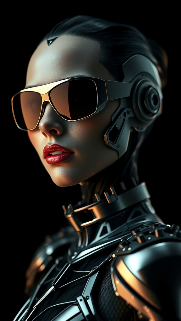 A hyper-realistic portrait of an android woman, her features delicately crafted with sleek metallic skin, wearing reflective sunglasses that capture glimmers of light. Her armor-like attire shimmers with an intricate, high-tech design, set against a stark black background. Studio lighting casts soft, ethereal shadows that enhance the cinematic mood, with every detail rendered in clean, sharp focus reminiscent of Tim Walker's photographic style. Delicate, illuminated circuits faintly trace the contours of her face, adding a futuristic allure to her expression.