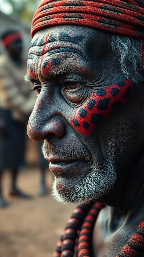 A hyper-realistic portrait of an elderly African warrior chief with tribal leopard-inspired makeup, blending deep blue and crimson hues. The chief gazes thoughtfully into the distance, his serious eyes reflecting a lifetime of wisdom and strength. The cinematic lighting accentuates the intricate patterns of the makeup and the texture of his weathered skin. In the background, subtle hints of a traditional village emerge in soft focus, enhancing the scene's rich cultural context.