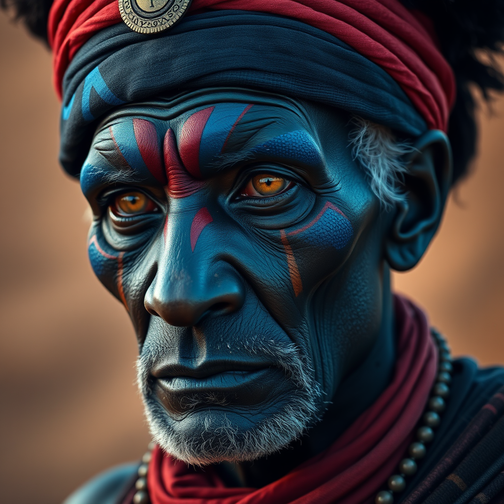 A hyper-realistic portrait of an elderly African warrior chief with tribal panther-inspired makeup in shades of deep blue and vibrant red, his serious eyes looking thoughtfully into the distance. The cinematic lighting casts dramatic shadows that accentuate the intricate details and wisdom lines of his face, highlighting his dignified presence. The backdrop is a subtle blend of earth tones, enhancing the chief's majestic and timeless aura.