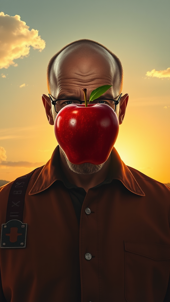 A hyper-realistic portrait of Bryan Cranston as Heisenberg from Breaking Bad, standing with a stern expression facing the viewer. A vibrant red apple is floating right in front of his face, partially obscuring it, with a backdrop of a golden sunrise against a clear sky with fluffy white clouds. The scene is painted in rich oil tones, capturing the surreal and enigmatic style reminiscent of René Magritte's artistry, similar to The Son of Man.
