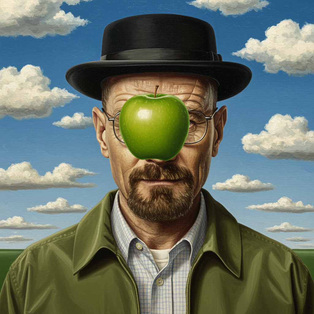 A hyper-realistic portrait of Bryan Cranston as Heisenberg from Breaking Bad, depicted in a surreal style. He stands front and center, a vibrant green apple levitating just before his face. Set against a backdrop of a vast, azure sky dotted with fluffy white clouds, the painting evokes an oil-on-canvas texture reminiscent of René Magritte's iconic style. Heisenberg's iconic hat casts a subtle shadow on his face, adding an element of mystery, while his expressive eyes peek from behind the apple, giving the scene a sense of enigmatic intrigue.
