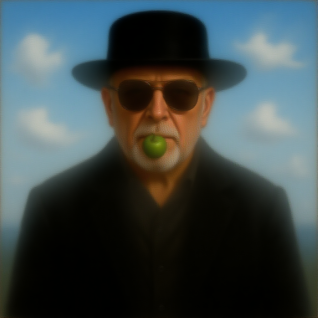 A hyper-realistic portrait of Bryan Cranston as Heisenberg from Breaking Bad, standing directly in front of the camera, with a green apple floating just in front of his face. The background features a serene blue sky with fluffy white clouds. His iconic black hat and sunglasses contrast against the Magritte-like surreal elements, adding an intriguing twist. The scene is reminiscent of an oil painting, capturing the dreamlike quality and subtle mystery evoked in René Magritte's "The Son of Man" style.