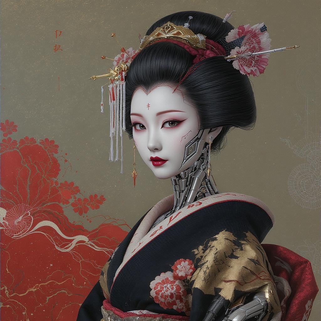 A hyper-realistic portrait painting of a Japanese robotic geisha featuring intricate kanji symbols and decals, rendered in stunning detail with octane precision. The piece captures a fusion of traditional elegance and advanced technology inspired by "Ex Machina" and "iRobot." Set in 4k and powered by Unreal Engine 5, the artwork exhibits flawless anatomy and impeccable design elements. The robotic geisha is portrayed with perfect harmony of form and function, seamlessly integrating mechanical features with traditional attire, all while maintaining a clean and polished aesthetic devoid of any visual errors or artifacts.
