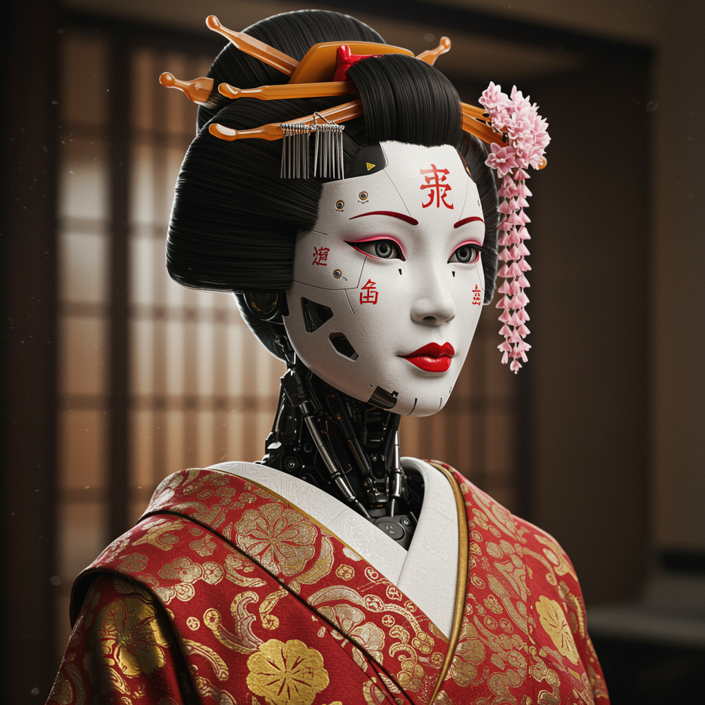 A hyper-realistic portrait painting of a Japanese robotic geisha, adorned with kanji symbols and intricate decals, rendered in Octane with exceptional detail and 4K clarity, visualized using Unreal Engine 5. Inspired by "Ex Machina" and "I, Robot," the artwork showcases seamless integration of robotics and traditional elegance, maintaining high-quality visuals without any artifacts or distortions. The composition highlights precise anatomy and well-rendered features, delivering a compelling and flawless interpretation of a futuristic geisha.