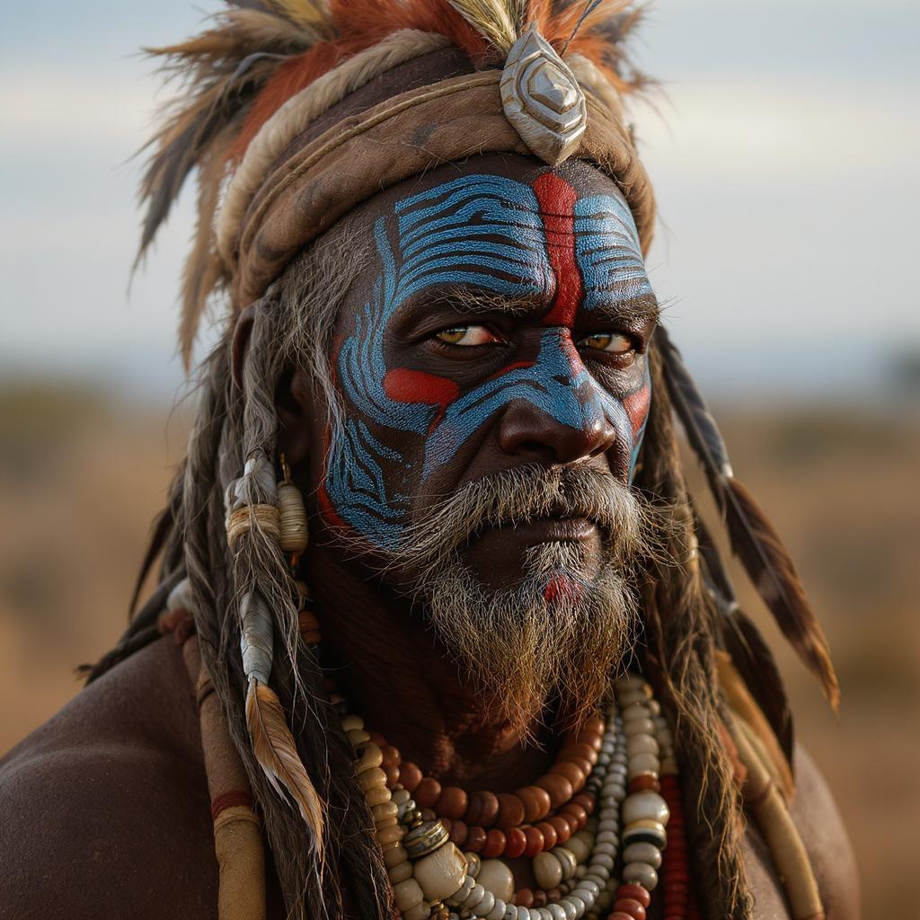 A hyper-realistic portrait photo of an aged African tribal warrior chief with intricate panther face paint in shades of deep blue and vibrant red. His expression is stoic and his piercing eyes look thoughtfully towards the horizon, exuding wisdom and strength. The scene is illuminated with cinematic lighting that highlights the textures of his weathered skin and the detailed patterns of his face paint. The chief's traditional attire is adorned with beads and feathers, adding to the regal presence. His hair, a crown of silvery grey, adds to his commanding aura. The backdrop is a subtle, blurred landscape that echoes the rich hues of the face paint, enhancing the composition's depth and drama.