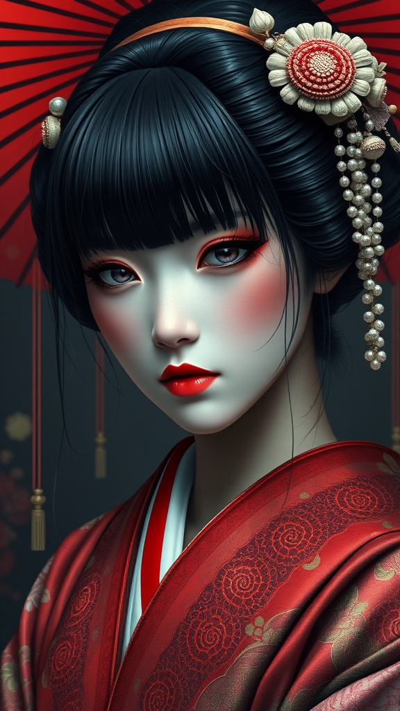 A hyper-realistic portrayal of a Japanese black-haired geisha with a somber expression, her visage artfully depicted with vibrant colors in a dripping art style. The composition is elaborately detailed, capturing the elegance and intricate patterns of her attire, within a hypermaximalist design. The scene is rendered in super-resolution, showcasing megapixel-level clarity, ensuring every facet is extraordinarily detailed and epic in its scope. Subtle creative elements add depth, enhancing the melancholic mood and cultural imagery.