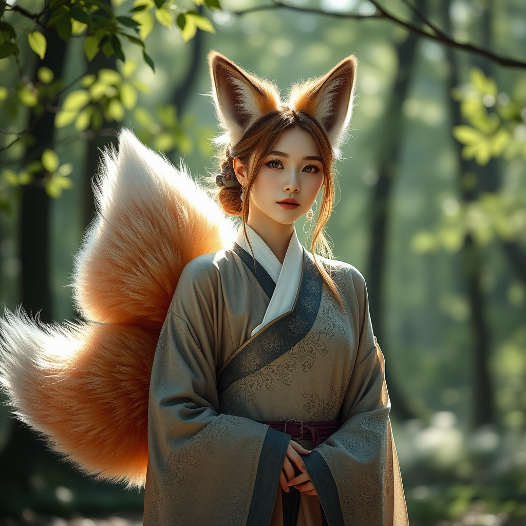 A hyper-realistic portrayal of a nine-tailed fox girl, capturing her ethereal beauty and mystical aura, as envisioned through the lenses of Wlop and Guweiz. She stands poised in a natural setting, her soft, fluffy tails gracefully fanned out. Her striking features are highlighted by the gentle caress of soft, natural lighting, creating an almost photographic quality to her appearance. The professional 8k detail showcases every nuance, from the delicate texture of her fur to the subtle shimmer in her eyes. Creative adjustments include a serene forest backdrop with dappled sunlight filtering through leaves, casting playful patterns on her elegant attire that blends traditional and modern elements.