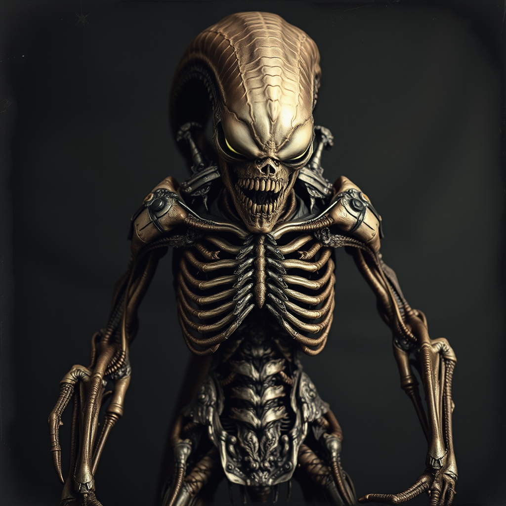 A hyper-realistic portrayal of a zombie xenomorph warrior, capturing a haunting character study reminiscent of Mathew Brady’s wet plate collodion techniques, with sharp, high detail. The portrait echoes the surreal and eerie artistry of Stefan Gesell and Emil Melmoth, infused with the biomechanical essence of H.R. Giger and the ornamental patterns of Gustav Klimt. The creature stands in a powerful stance, its skin a textured tapestry of decay interwoven with alien exoskeleton elements, all rendered in intricate, haunting detail, its eyes reflecting a chilling sentience. The background is a dark, atmospheric void, enhancing its imposing presence.