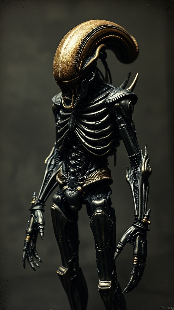 A hyper-realistic portrayal of a zombie xenomorph warrior, captured with wet plate collodion technique reminiscent of Mathew Brady's sharp and high-detail portraits, infused with the dark, surreal style signature to Stefan Gesell and Emil Melmoth. The warrior exudes an eerie, macabre elegance with intricate biomechanical elements inspired by HR Giger, melding seamlessly with an alien skin texture that echoes the gilded patterns of Klimt. The character stands in an austere, shadowy environment, its metallic exoskeleton glistening with an ominous sheen, embodying an unsettling fusion of the gothic and otherworldly, each detail meticulous and hauntingly vivid.