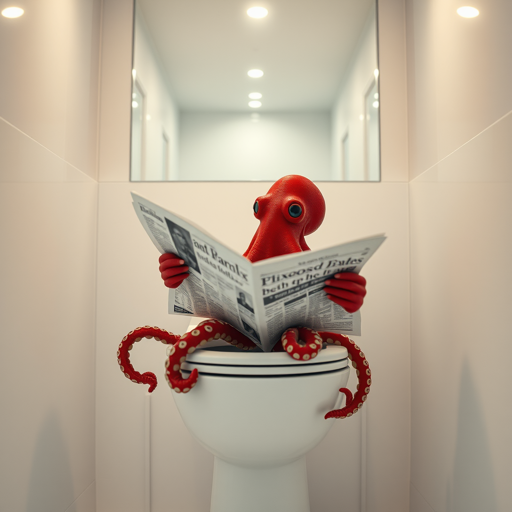 A hyper-realistic red octopus sits on a toilet reading a newspaper, surrounded by a serene environment of white tones and bright white lights. The setting features a white wall and a mirror behind the octopus, reflecting soft LED glows. The ambient lighting is cinematic and highly detailed, emphasizing a clean aesthetic without dark tones. The glow lights cast a gentle luminescence, enhancing the intricate details of the scene.