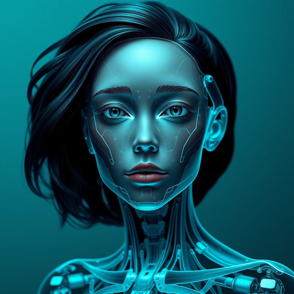 A hyper-realistic representation of a humanlike android's face, capturing a youthful and energetic essence. The design resembles x-ray film, featuring a feminine body with a focus on the elegant structure and articulation of joints and connections. The color palette is dominated by dark cyan and black, evoking a mysterious yet sophisticated aura. The composition is akin to graceful sculptures, exuding a sense of dynamic beauty and subtle strength.