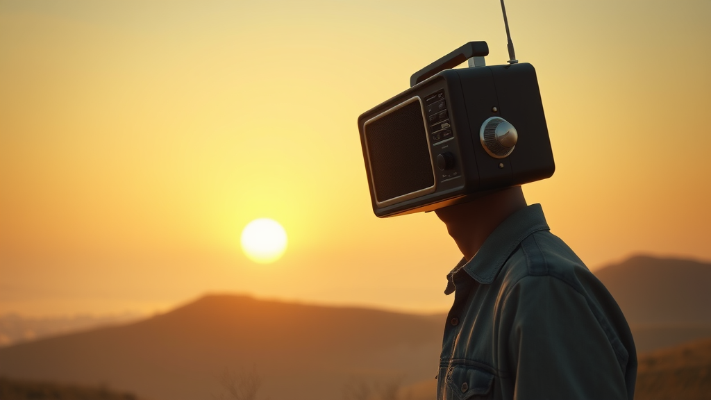 A hyper-realistic scene depicting a man with a vintage radio for a head, bathed in dramatic light against the backdrop of a pale sunrise. Cinematic lighting enhances the atmosphere in a low-angle perspective, capturing extreme details in 4k resolution. The setting is reminiscent of a masterpiece created using Unreal Engine 5. The scene exudes a Studio Ghibli-inspired charm with intricate artwork, featuring a landscape akin to John Constable’s dreamy depictions, with rolling hills and wisps of fog gently hugging the scenery.
