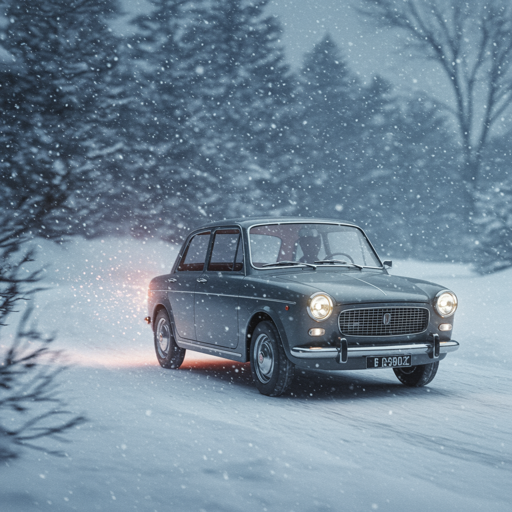A hyper-realistic scene featuring a classic grey 1960 Fiat cruising along a snowy winter road, surrounded by an ethereal glow that highlights its timeless elegance amidst a serene landscape, with soft snowflakes gently falling, adding a touch of nostalgia and wonder.