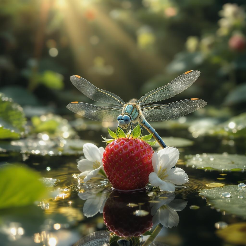 A hyper-realistic scene featuring a dragonfly perched lightly on a succulent strawberry, surrounded by delicate white strawberry flowers, set in a tranquil pond sprinkled with reflective dew drops. The dragonfly's wings are intricately detailed with iridescent colors, and its eyes glisten with a mosaic of tiny reflections. The background reveals a lush, green haven filled with vibrant flora, softened by artistic bokeh effects. Soft beams of sunlight dance across the scene, casting light and shadow to add depth and dimension to this captivating natural tableau.