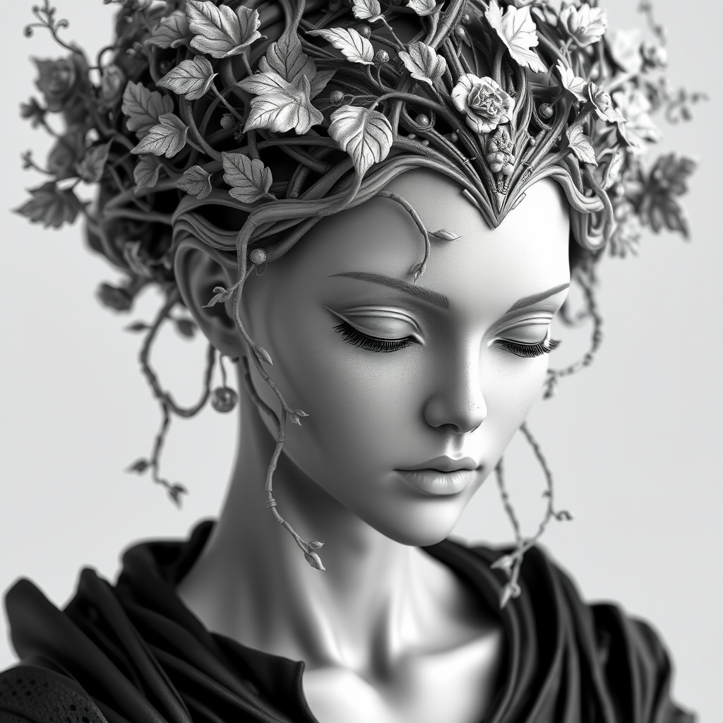 a hyper-realistic sci-fi black and white sculpture of a woman, adorned with an intricate, futuristic crown, detailed nature elements woven into the design, showcasing delicate vines and leaves, sculpted with high precision in zbrush, capturing an ethereal essence and blending technological elegance with natural motifs