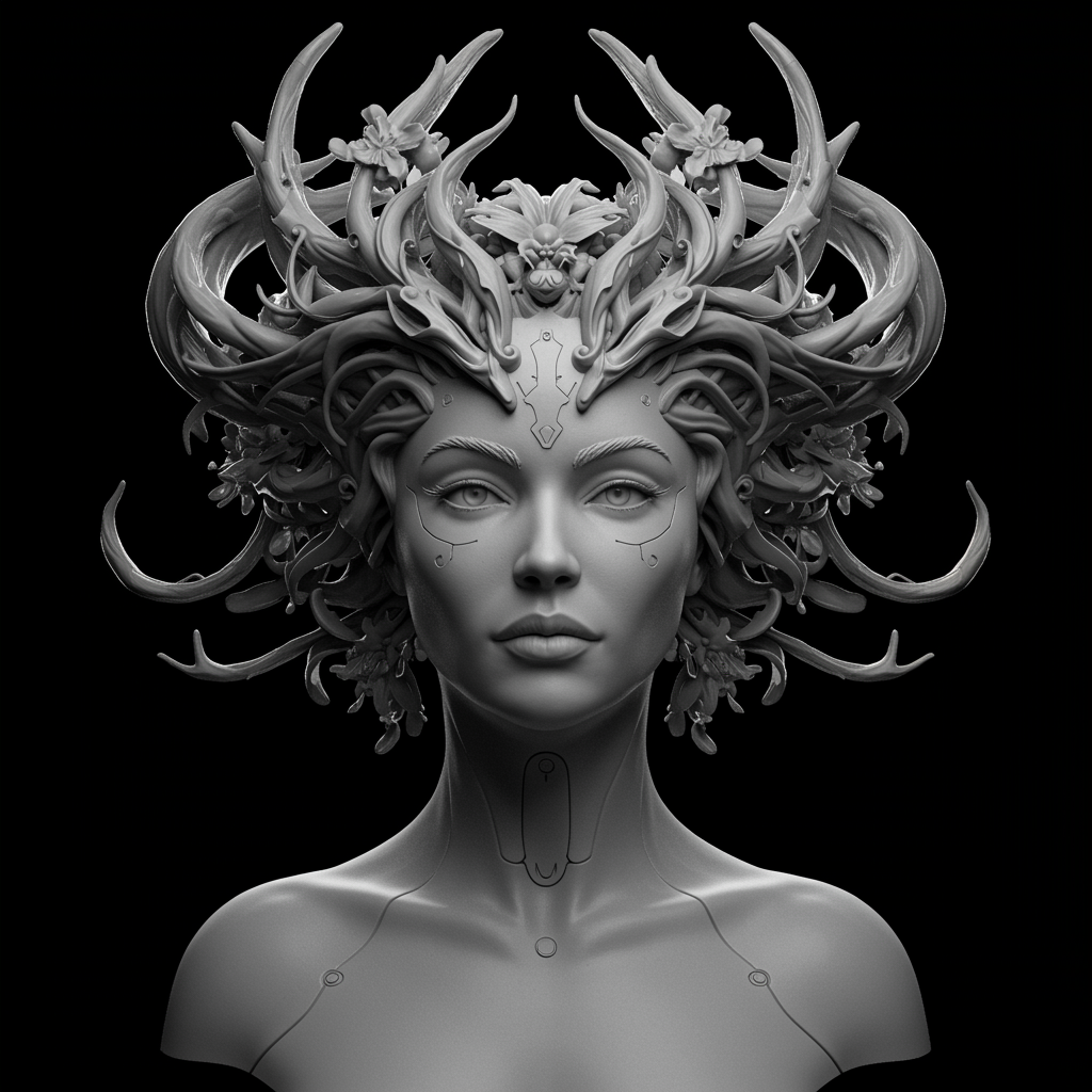 A hyper-realistic sci-fi sculpture crafted in ZBrush, depicting a woman with an intricate, otherworldly crown woven from twisting vines and ethereal flora. Her features are exquisitely detailed, capturing both the strength and grace of her form, while subtle textures mimic the interplay of light and shadow on smooth, polished surfaces. The black and white palette enhances the contrast, accentuating the lifelike complexity of her expression and the elaborate organic elements entwined around her crown, evoking a seamless fusion of technology and nature.