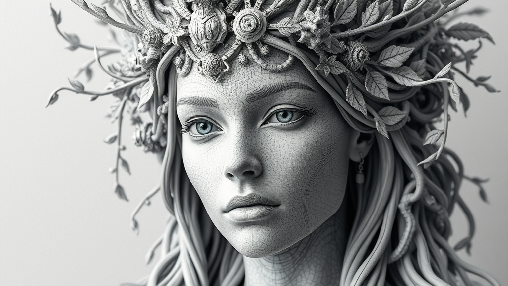 A hyper-realistic sci-fi sculpture depicts a woman adorned with an intricate crown, expertly crafted in grayscale. The crown is an elaborate fusion of mechanical elements and organic forms, featuring delicate vines and leaves that intertwine with futuristic circuitry. Her expression is serene yet commanding, capturing an otherworldly presence. The detailed textures of her skin and the finely sculpted features blend seamlessly with the crown's complex layers, showcasing an exquisite balance between nature and advanced technology. Her eyes are alive with a mysterious luminescence that hints at hidden depths, completing the ethereal yet formidable depiction of a queen from a world where nature and science are intertwined.