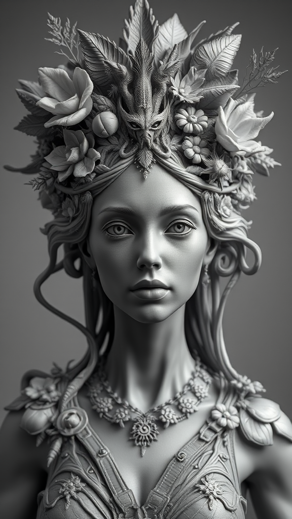 A hyper-realistic sci-fi sculpture of a woman adorned with an intricate crown, crafted in black and white; the sculpture features detailed depictions of nature intricately woven into her attire, using ZBrush for lifelike textures; her expression is serene yet powerful, with the crown resembling an alien ecosystem, fusing elements of flora and fauna, creating a harmonious blend of organic and futuristic design.